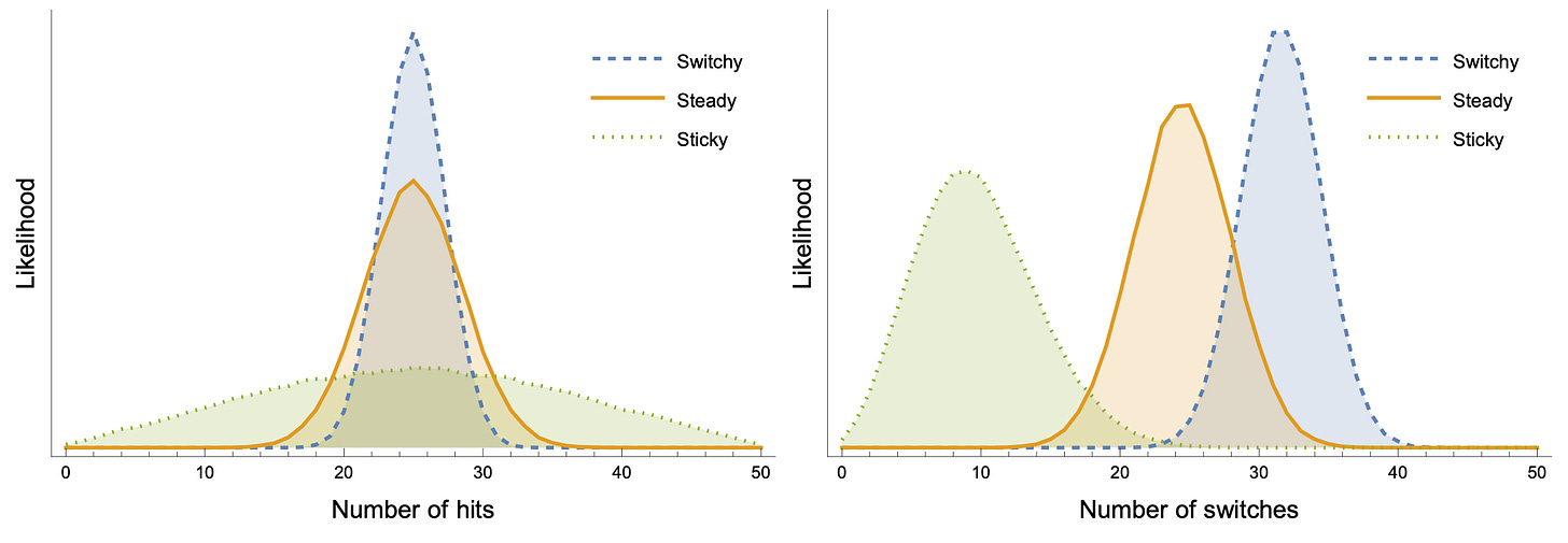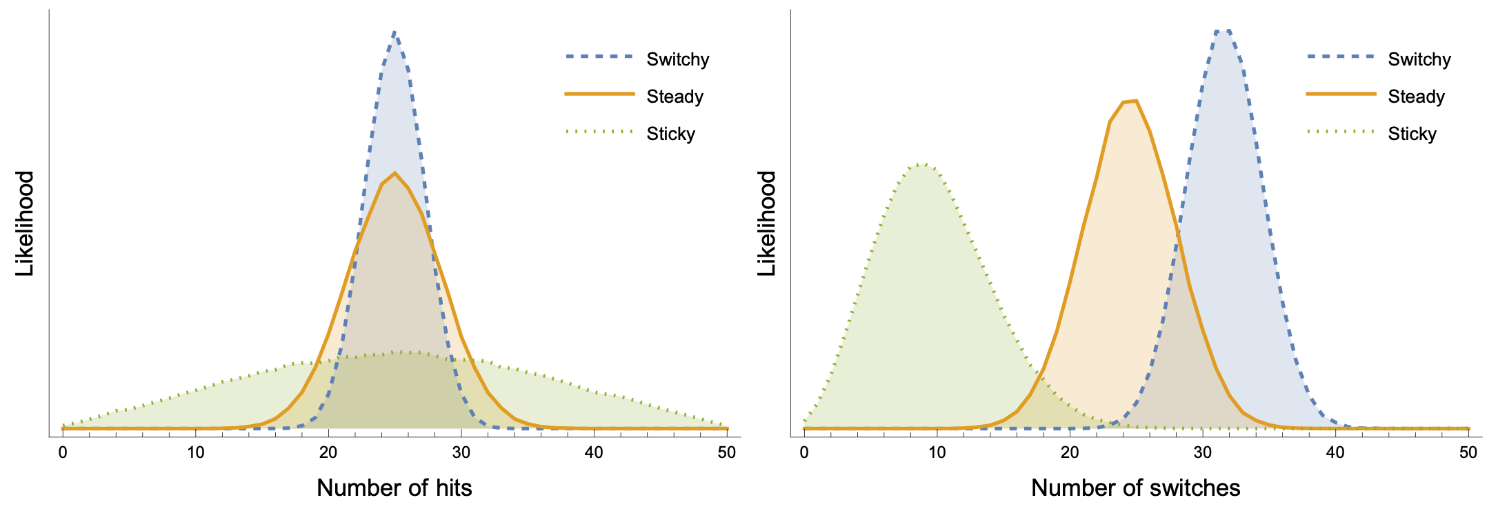 Why is it easier to rule out Sticky than Switchy? The data generated by Steady turns out to be more similar to the data generated by Switchy than by Sticky. We can see this, for instance, by plotting the likelihoods of summary statistics—like number of Priuses (“hits”, left), or number of switches (right)—when we generate length-50 sequences: