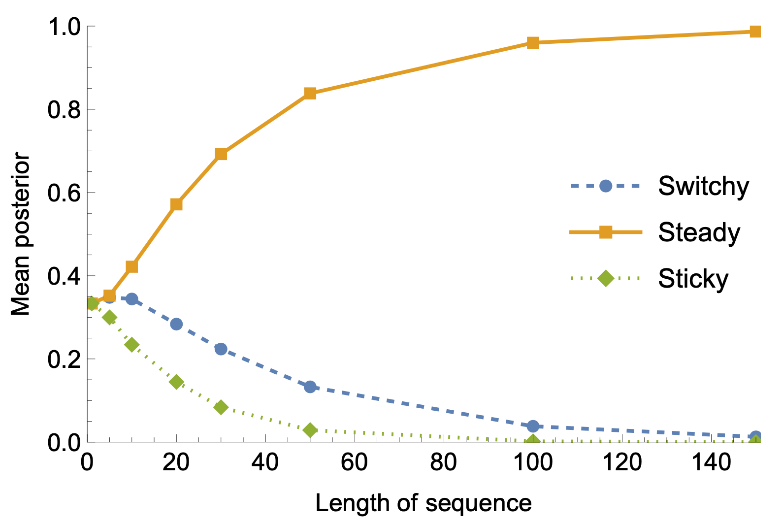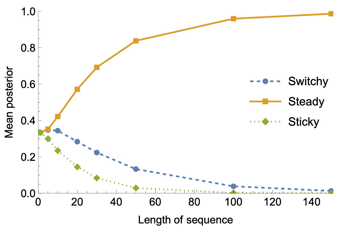 That’s no coincidence. Despite the apparent symmetry between Switchy and Sticky, it turns out that—if Steady is true—then it is easier to rule out Sticky than to rule out Switchy. Thus, as Bayesians observe data from an (in fact) Steady process, they will quickly rule out Sticky and slowly rule out Switchy, as in the above example. This asymmetric convergence toward the truth will lead them to, on average, commit the gambler’s fallacy.