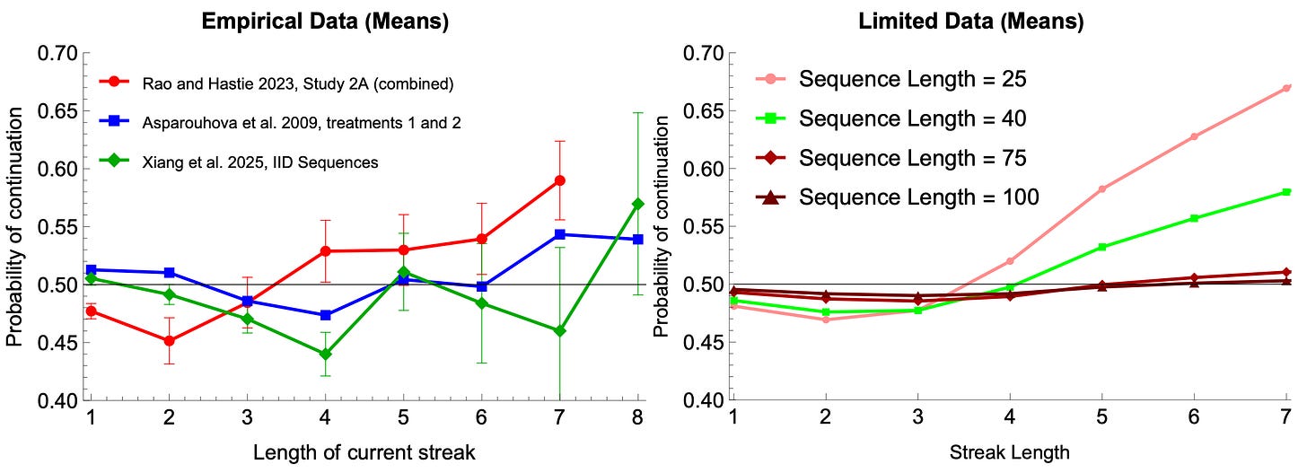 So do Bayesians: short streaks are evidence that the process is primed to switch, but long streaks are evidence that the process is Sticky—eventually leading them to predict continuations (below, right).